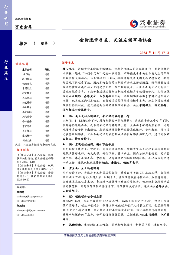 【兴业证券】【20241117】20241117-兴业证券-有色金属行业:金价逐步寻底,关注左侧布局机会-30页