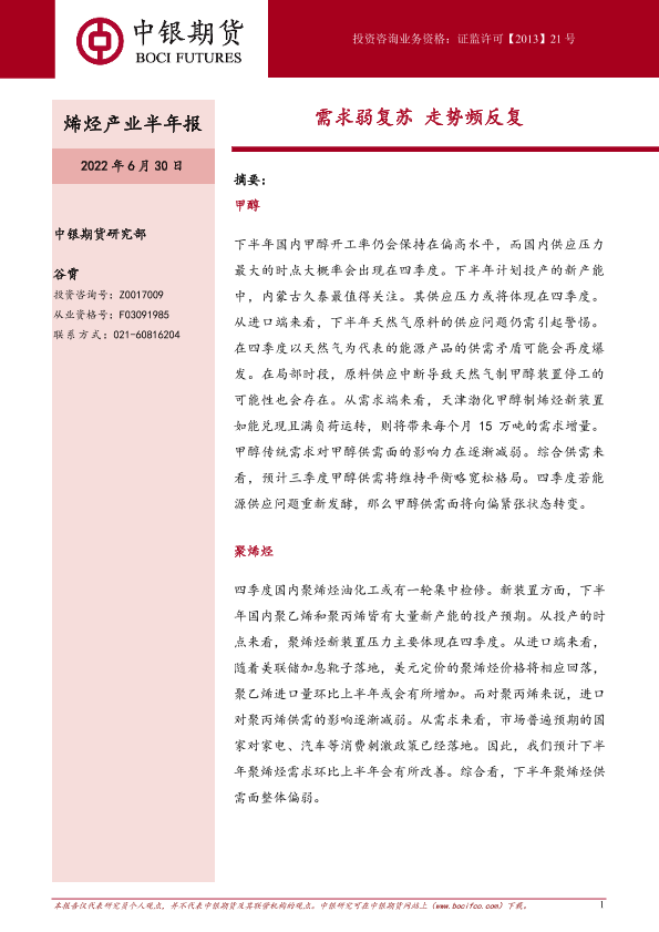 【中银期货】【20220630】烯烃产业半年报:需求弱复苏,走势频反复-26页