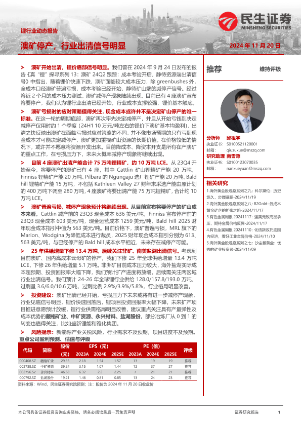 【民生证券】【20241120】锂行业动态报告:澳矿停产,行业出清信号明显-17页