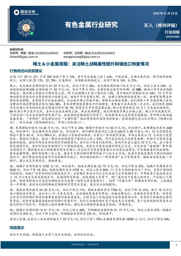 【国金证券】【20241123】20241123-国金证券-稀土&小金属周报:关注稀土战略属性提升和锑出口恢复情况-14页