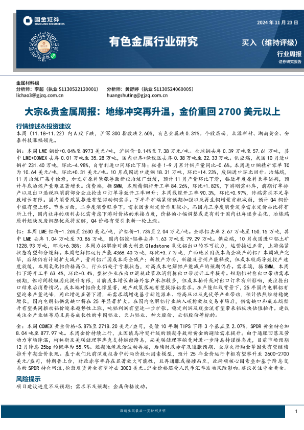【国金证券】【20241123】20241123-国金证券-大宗&贵金属周报:地缘冲突再升温,金价重回2700美元以上-15页