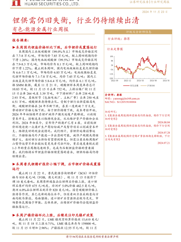 【华西证券】【20241123】20241123-华西证券-有色-能源金属行业周报:锂供需仍旧失衡,行业仍待继续出清-50页