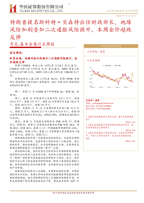 【华西证券】【20241123】20241123-华西证券-有色-基本金属行业周报:特朗普提名斯科特·贝森特出任财政部长,地缘风险加剧叠加二次通胀风险提升,本周金价超跌反弹-30页