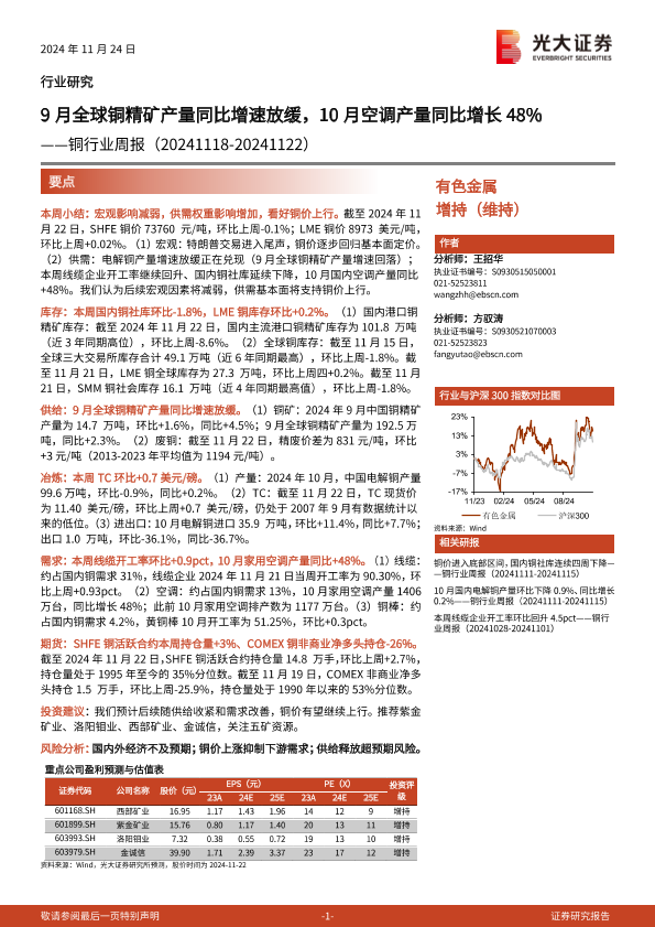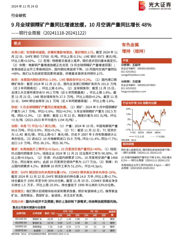【光大证券】【20241124】20241124-光大证券-铜行业周报:9月全球铜精矿产量同比增速放缓,10月空调产量同比增长48%-18页