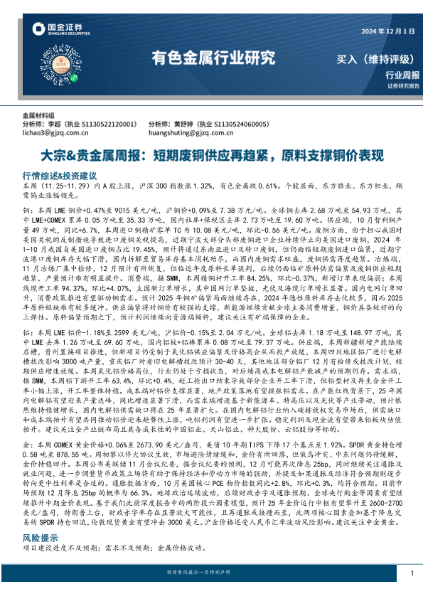 【国金证券】【20241201】20241201-国金证券-大宗&贵金属周报:短期废铜供应再趋紧,原料支撑铜价表现-14页