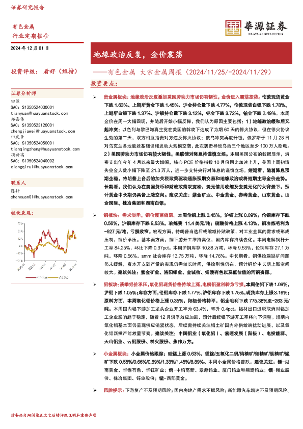 【华源证券】【20241201】有色金属大宗金属周报:地缘政治反复,金价震荡-17页