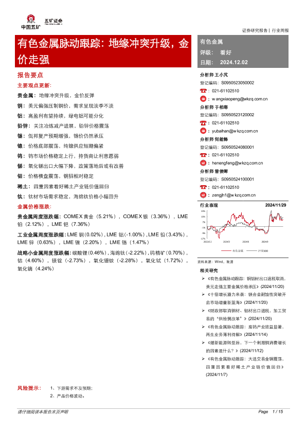 【五矿证券】【20241202】有色金属脉动跟踪:地缘冲突升级,金价走强-15页