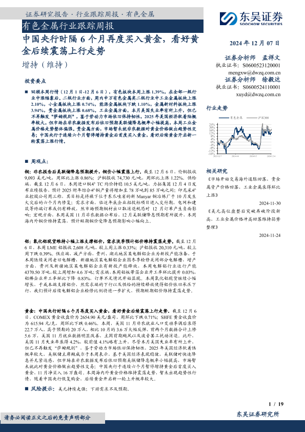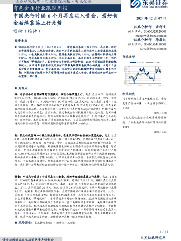 【东吴证券】【20241207】20241207-东吴证券-有色金属行业跟踪周报:中国央行时隔6个月再度买入黄金,看好黄金后续震荡上行走势-19页