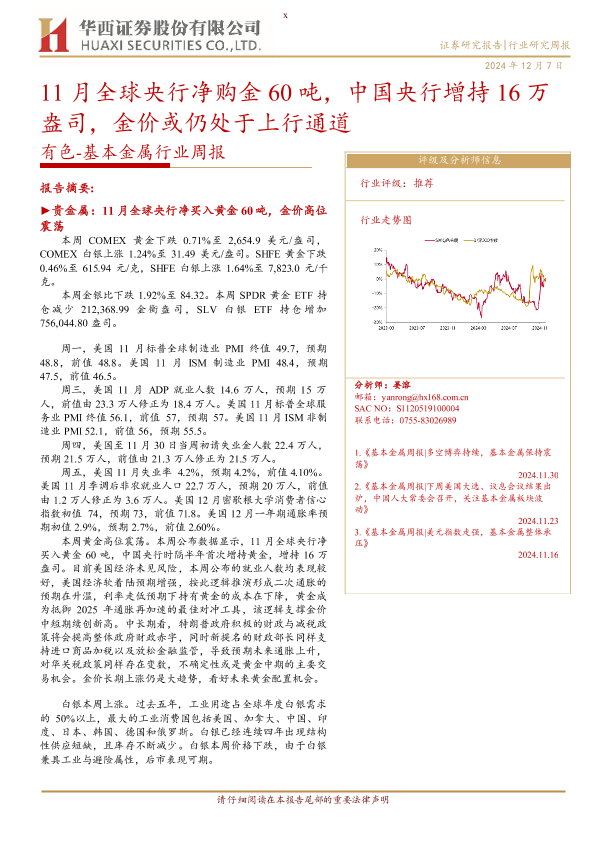 【华西证券】【20241207】20241207-华西证券-有色-基本金属行业周报:11月全球央行净购金60吨,中国央行增持16万盎司,金价或仍处于上行通道-21页