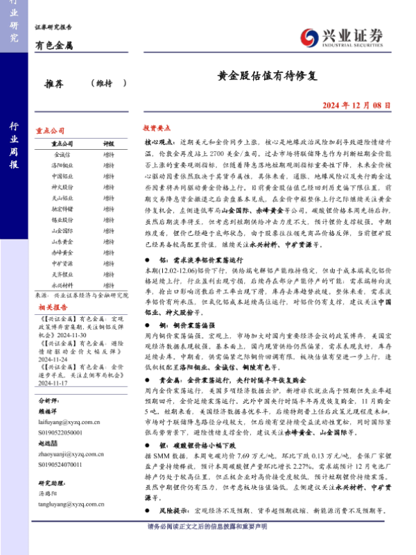 【兴业证券】【20241208】20241208-兴业证券-有色金属行业周报:黄金股估值有待修复-30页