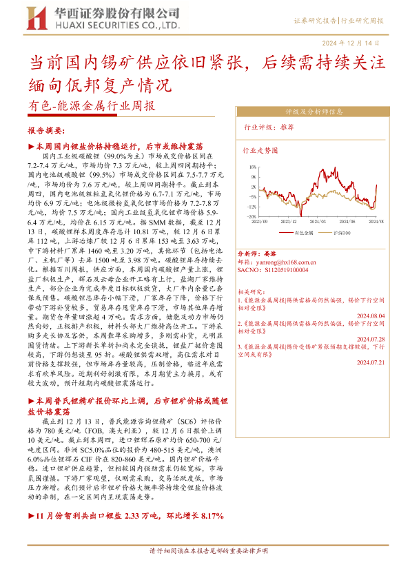 【华西证券】【20241214】20241214-华西证券-有色-能源金属行业周报:当前国内锡矿供应依旧紧张,后续需持续关注缅甸佤邦复产情况-25页