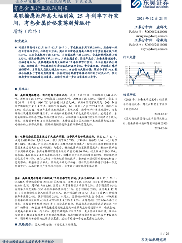 【东吴证券】【20241221】20241221-东吴证券-有色金属行业跟踪周报:美联储鹰派降息大幅削减25年利率下行空间,有色金属价格震荡弱势运行-20页