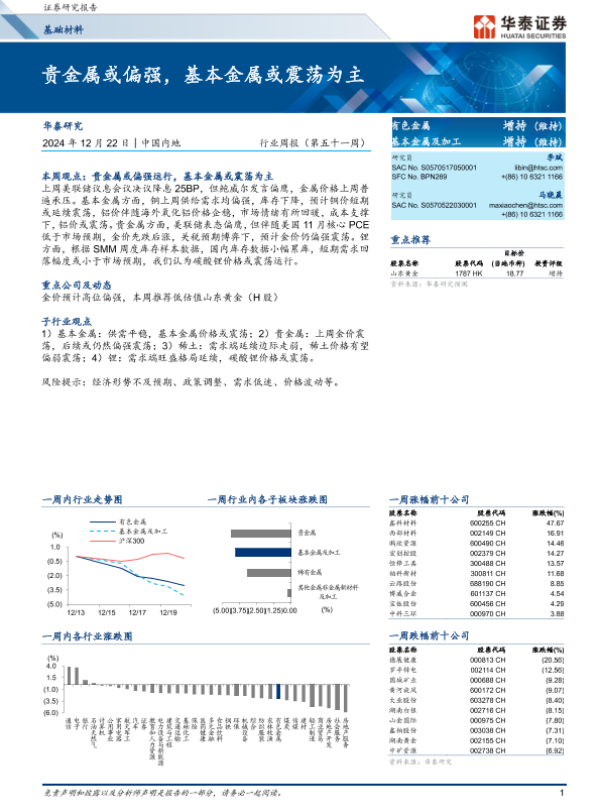 【华泰证券】【20241222】20241222-华泰证券-基础材料行业周报(第五十一周):贵金属或偏强,基本金属或震荡为主-16页