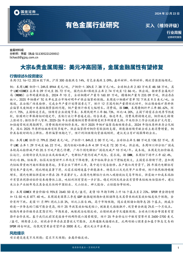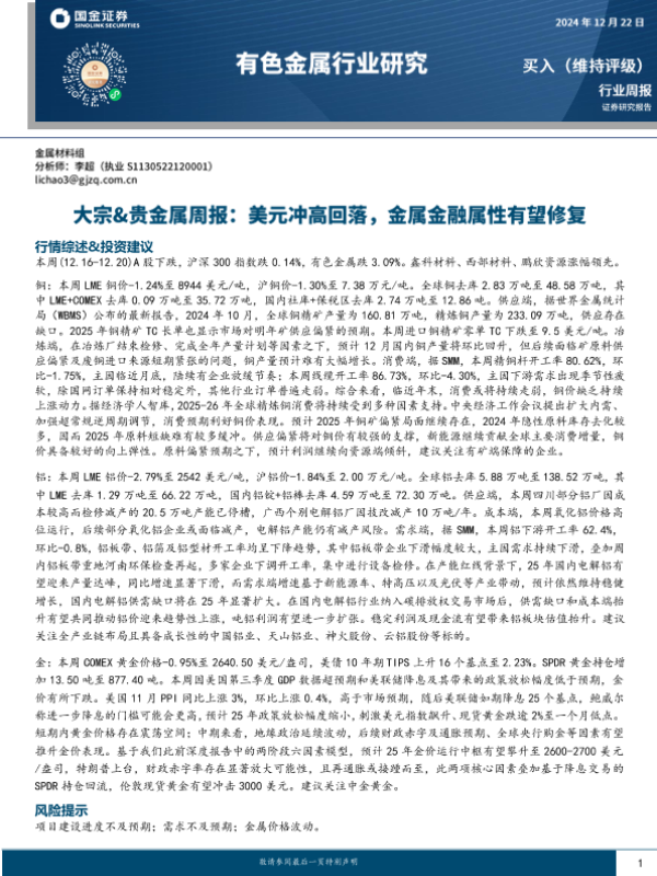 【国金证券】【20241222】20241222-国金证券-有色金属行业研究:大宗&贵金属周报:美元冲高回落,金属金融属性有望修复-14页