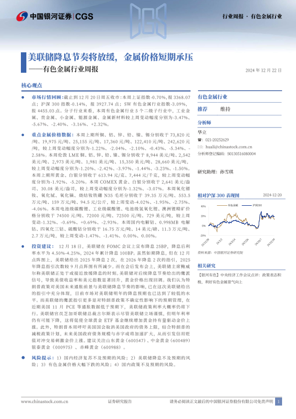 【银河证券】【20241222】20241222-中国银河-有色金属行业周报:美联储降息节奏将放缓,金属价格短期承压-20页
