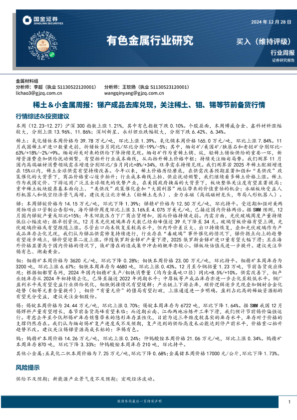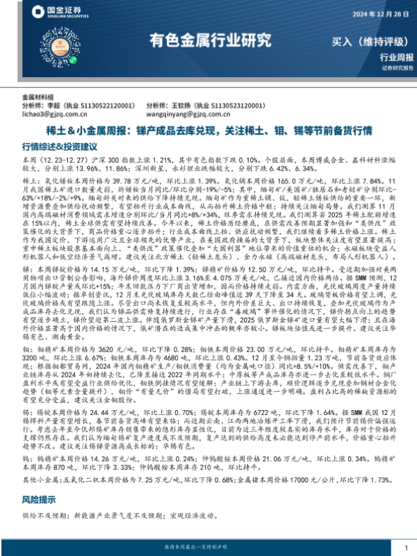 【国金证券】【20241228】20241228-国金证券-稀土&小金属周报:锑产成品去库兑现,关注稀土、钼、锡等节前备货行情-14页