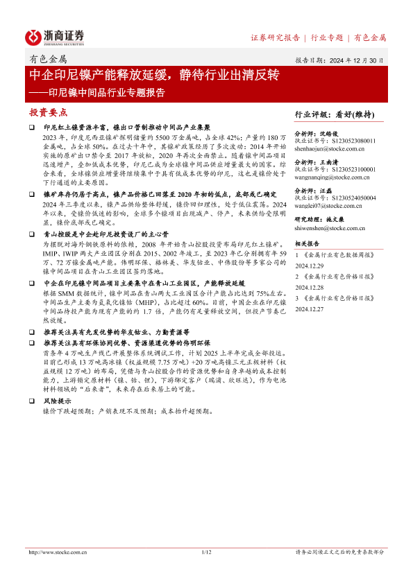 【浙商证券】【20241230】20241230-浙商证券-印尼镍中间品行业专题报告:中企印尼镍产能释放延缓,静待行业出清反转-12页