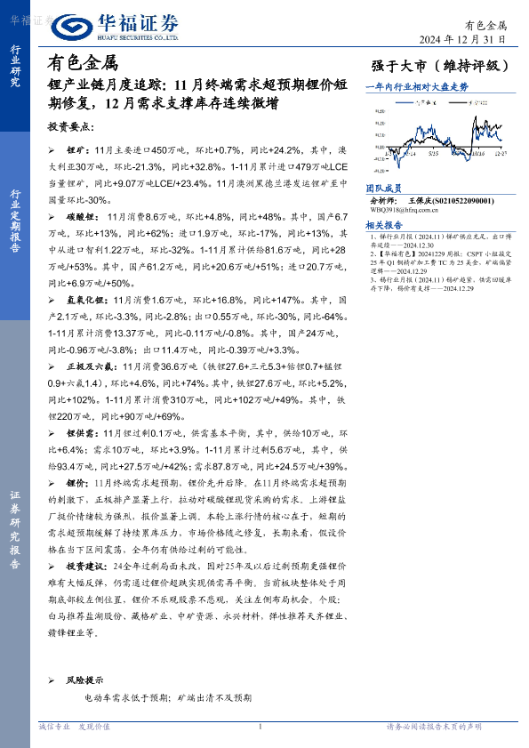 【华福证券】【20241231】锂产业链月度追踪:11月终端需求超预期锂价短期修复,12月需求支撑库存连续微增-18页