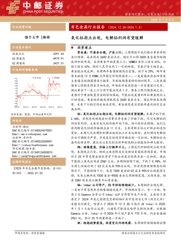 【中邮证券】【20250104】20250104-中邮证券-有色金属行业报告:氧化铝拐点出现,电解铝利润有望缓解-12页