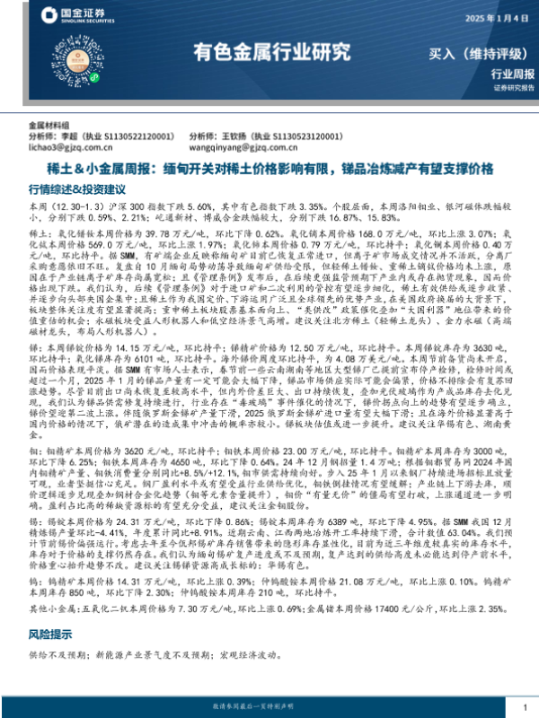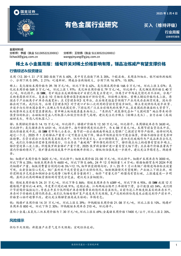 【国金证券】【20250104】稀土&小金属周报:缅甸开关对稀土价格影响有限,锑品冶炼减产有望支撑价格-13页
