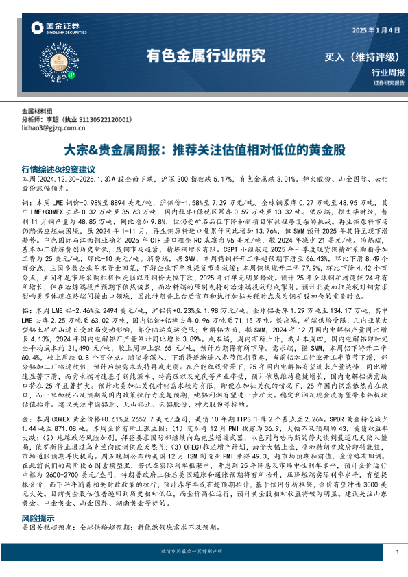【国金证券】【20250104】20250104-国金证券-大宗&贵金属周报:推荐关注估值相对低位的黄金股-14页