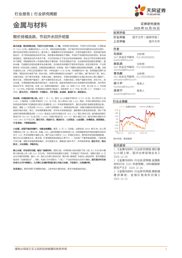 【天风证券】【20250105】20250105-天风证券-金属与材料行业研究周报:铜价持续走跌,节后升水回升明显-16页
