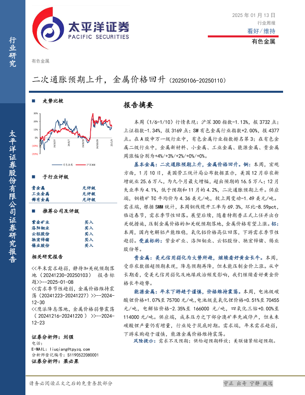【太平洋证券】【20250113】20250113-太平洋-有色金属行业周报:二次通胀预期上升,金属价格回升-22页