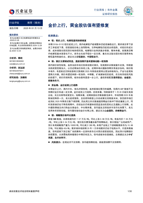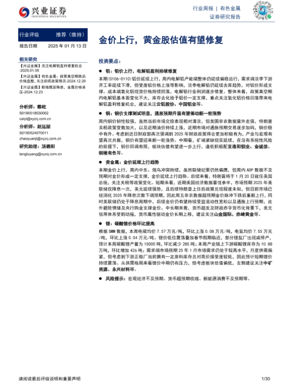 【兴业证券】【20250113】20250113-兴业证券-有色金属行业周报:金价上行,黄金股估值有望修复-30页