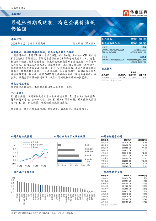【华泰证券】【20250119】20250119-华泰证券-有色金属行业周报(第三周): 再通胀预期或延续,有色金属价格或仍偏强-16页