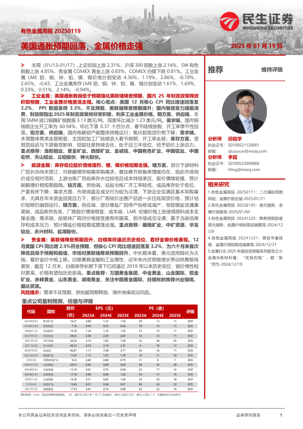 【民生证券】【20250119】20250119-民生证券-有色金属周报:美国通胀预期回落,金属价格走强-29页