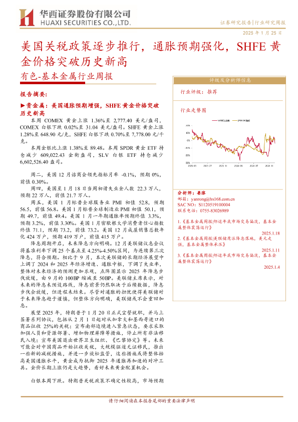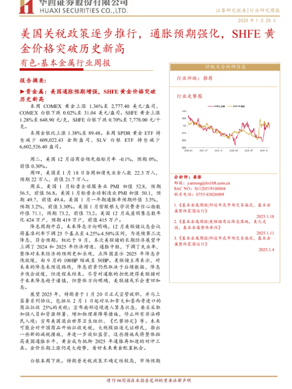 【华西证券】【20250125】20250125-华西证券-有色-基本金属行业周报:美国关税政策逐步推行,通胀预期强化,SHFE黄金价格突破历史新高-23页