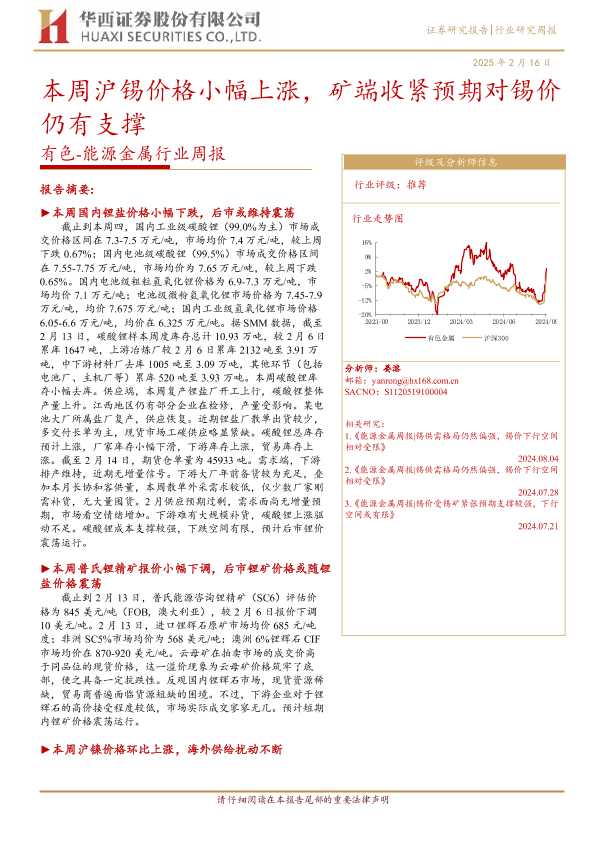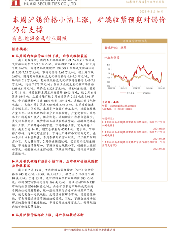 【华西证券】【20250216】20250216-华西证券-有色-能源金属行业周报:本周沪锡价格小幅上涨,矿端收紧预期对锡价仍有支撑-30页
