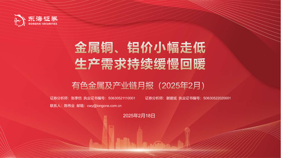 【东海证券】【20250218】有色金属及产业链月报(2025年2月):金属铜、铝价小幅走低 生产需求持续缓慢回暖-21页