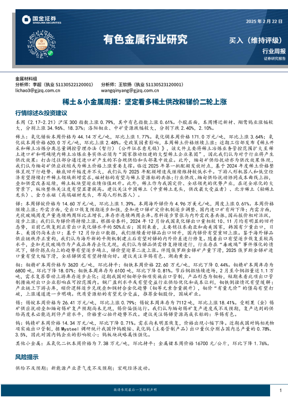 【国金证券】【20250222】20250222-国金证券-稀土&小金属周报:坚定看多稀土供改和锑价二轮上涨-14页