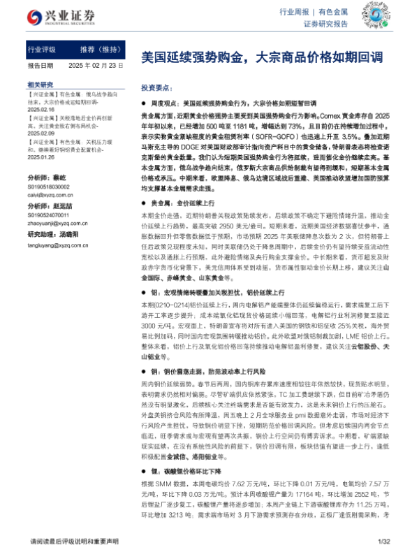 【兴业证券】【20250223】20250223-兴业证券-有色金属行业周报:美国延续强势购金,大宗商品价格如期回调-32页