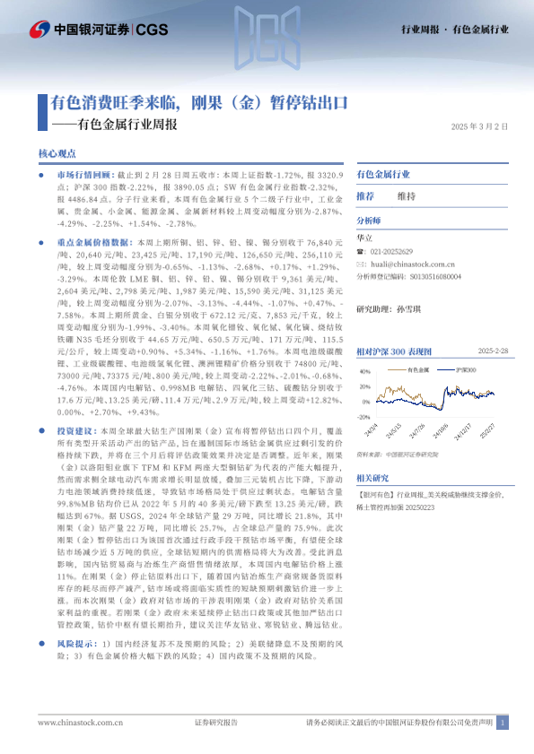 【银河证券】【20250302】20250302-中国银河-有色金属行业周报:有色消费旺季来临,刚果(金)暂停钴出口-20页