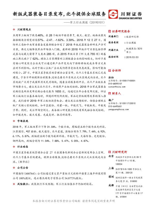 【川财证券】【20190101】20190101-川财证券-军工行业周报:新版武器装备目录发布,北斗提供全球服务-10页