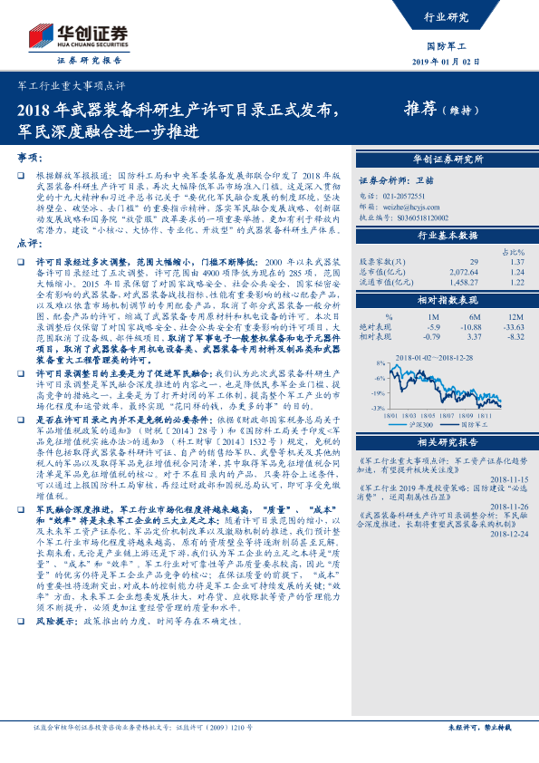 【华创证券】【20190102】20190102-华创证券-军工行业重大事项点评:2018年武器装备科研生产许可目录正式发布,军民深度融合进一步推进-8页