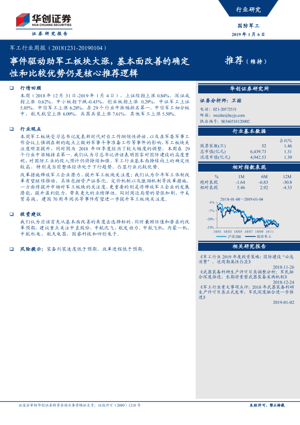 【华创证券】【20190106】20190106-华创证券-军工行业周报:事件驱动助军工板块大涨,基本面改善的确定性和比较优势仍是核心推荐逻辑-11页