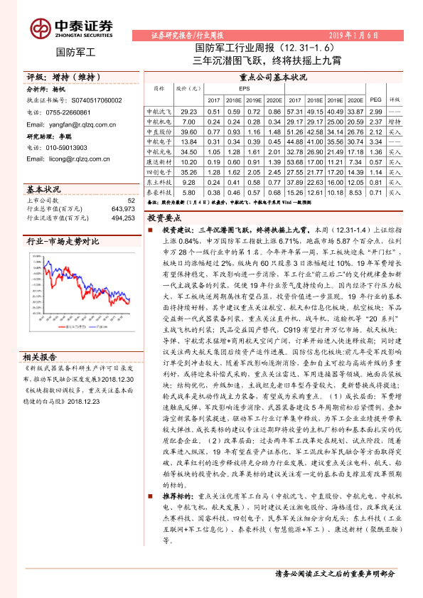 【中泰证券】【20190106】国防军工行业周报:三年沉潜图飞跃,终将扶摇上九霄-12页