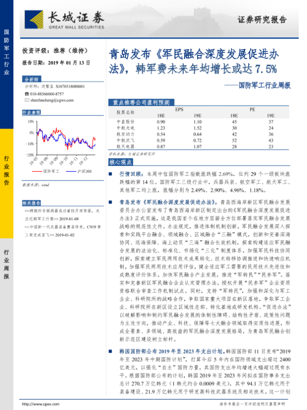 【长城证券】【20190113】20190113-长城证券-国防军工行业周报:青岛发布《军民融合深度发展促进办法》,韩军费未来年均增长或达7.5%-13页