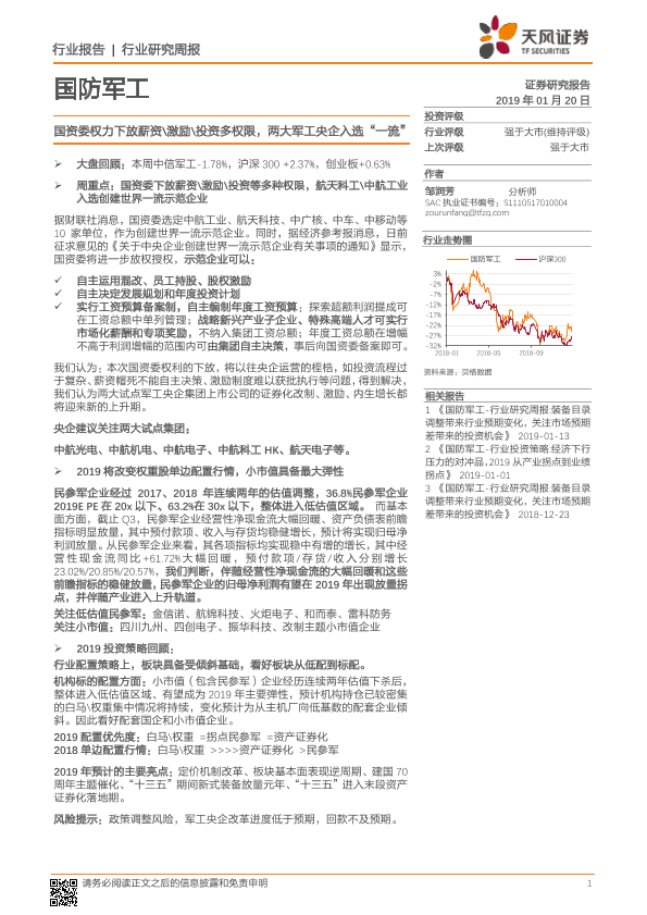 【天风证券】【20190120】国防军工行业研究周报:国资委权力下放薪资激励投资多权限,两大军工央企入选“一流”-7页