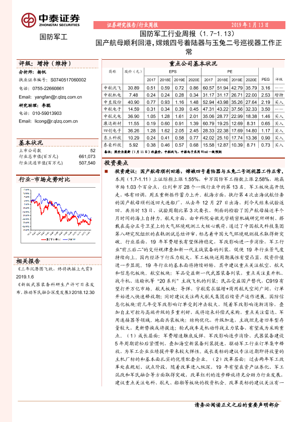 【中泰证券】【20190113】20190113-中泰证券-国防军工行业周报:国产航母顺利回港,嫦娥四号着陆器与玉兔二号巡视器工作正常-11页
