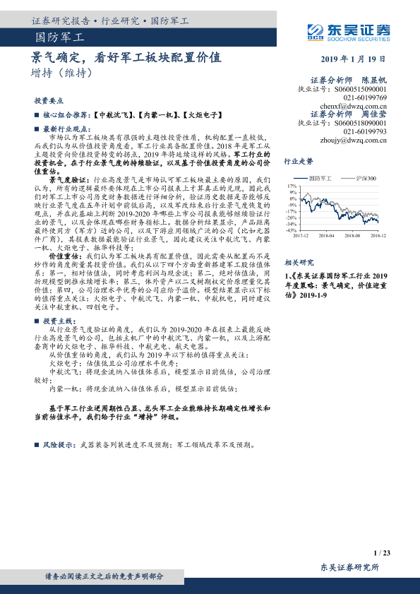 【东吴证券】【20190119】国防军工:景气确定,看好军工板块配置价值-23页
