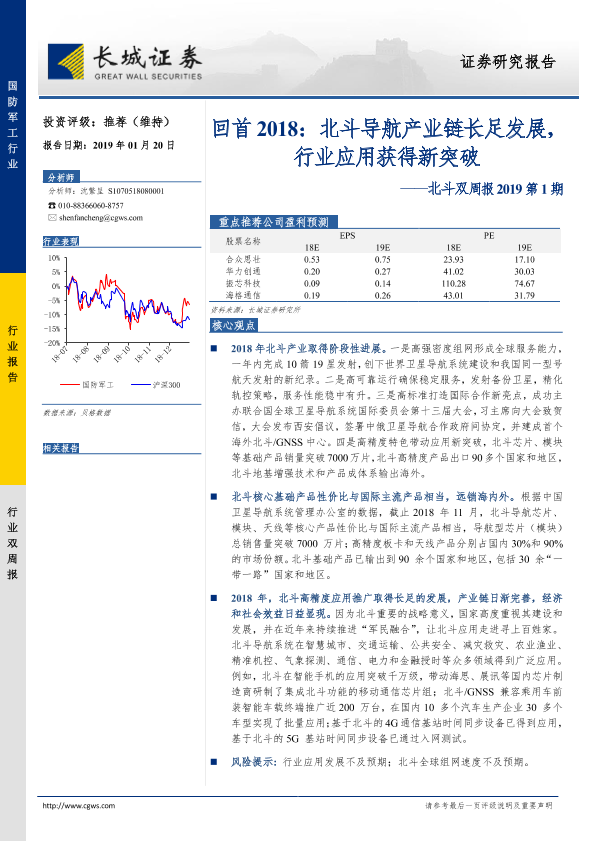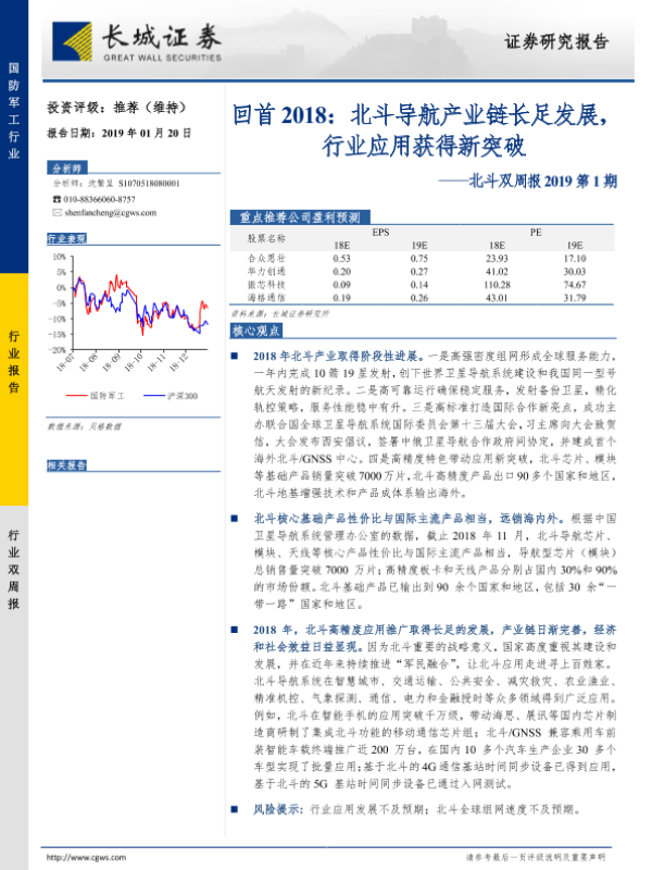 【长城证券】【20190120】20190120-长城证券-北斗双周报2019第1期:回首2018:北斗导航产业链长足发展,行业应用获得新突破-12页