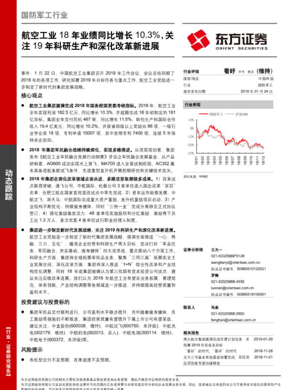 【东方证券】【20190124】国防军工行业:航空工业18年业绩同比增长10.3%,关注19年科研生产和深化改革新进展-3页