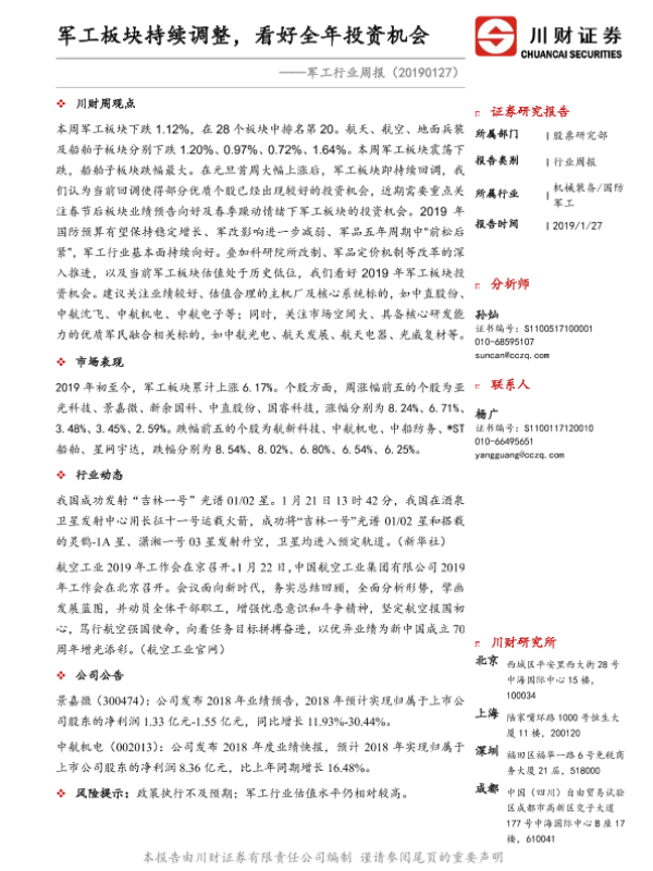 【川财证券】【20190127】军工板块持续调整,看好全年投资机会-10页