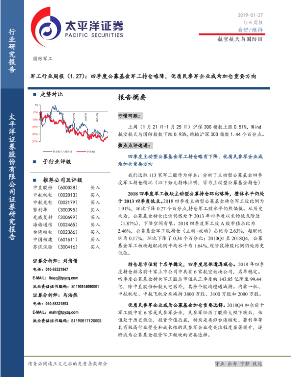 【太平洋证券】【20190127】军工行业周报:四季度公募基金军工持仓略降,优质民参军企业成为加仓重要方向-26页