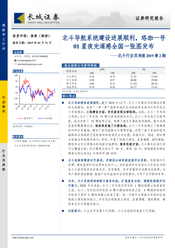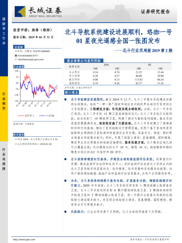 【长城证券】【20190131】20190131-长城证券-北斗行业双周报2019第2期:北斗导航系统建设进展顺利,珞珈一号01星夜光遥感全国一张图发布-13页