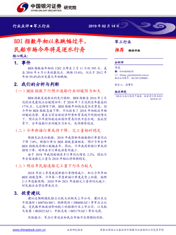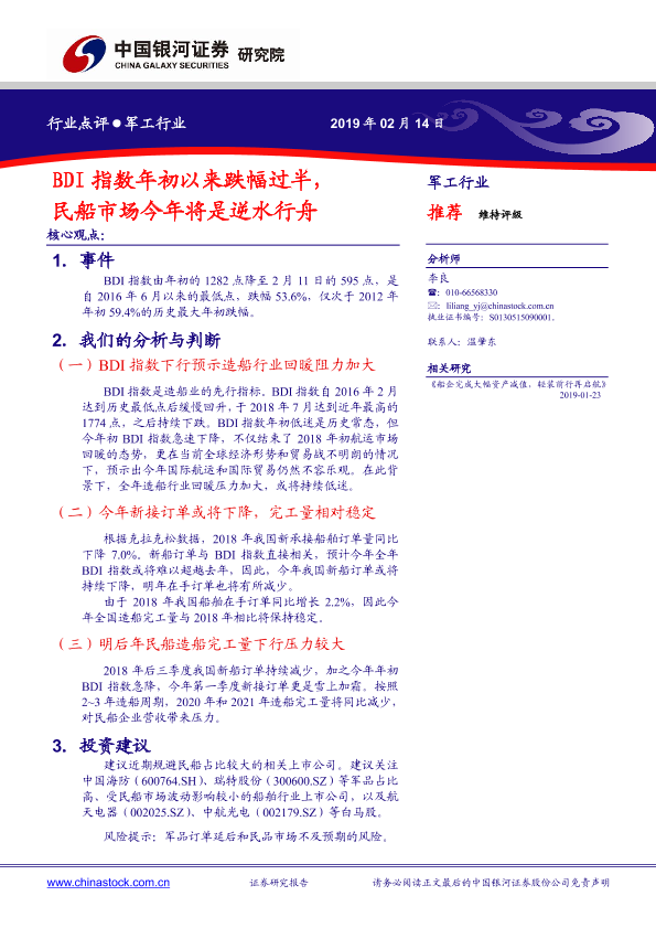 【银河证券】【20190214】军工行业:BDI指数年初以来跌幅过半,民船市场今年将是逆水行舟-3页